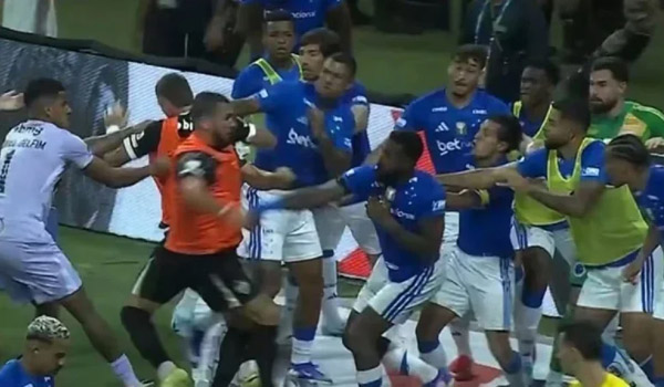 রেফারি পরিস্থিতি নরম করার চেষ্টা করলেও মুহূর্তের মধ্যে উত্তেজনা আরও জোরালো হয়। পেছন থেকে ক্রুজেইরোর এক খেলোয়াড় এভারসনকে ধাক্কা দিলে গোলরক্ষক গোলপোস্টে আঘাত পেয়ে পড়েন; ঠিক এরপর থেকে দুই দলের খেলোয়াড়েরা একে অন্যকে কিল-ঘুষি ও লাথি মারতে লাগেন। বিষয়টি কেবল মাঠের খেলোয়াড়ের মধ্যেই সীমাবদ্ধ থাকেনি—ডাগআউট থেকে বেঞ্চের খেলোয়াড় এবং ক্লাব স্টাফরাও বrawl-এ জড়িয়ে পড়ে।