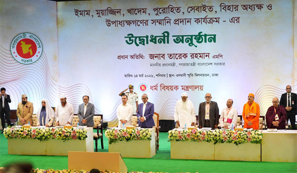 ধর্মীয় ও সামাজিক সম্প্রীতি জোরদার করার লক্ষ্যে মসজিদ, মন্দির, গির্জা ও বৌদ্ধবিহারের ধর্মপ্রধানদের মাসিক সম্মানী প্রদান কার্যক্রমের শুভ উদ্বোধন করেছেন প্রধানমন্ত্রী তারেক রহমান। আজ শনিবার (১৪ মার্চ) রাজধানীর ওসমানী স্মৃতি মিলনায়তনে এ কর্মসূচি আনুষ্ঠানিকভাবে শুরু করা হয়।