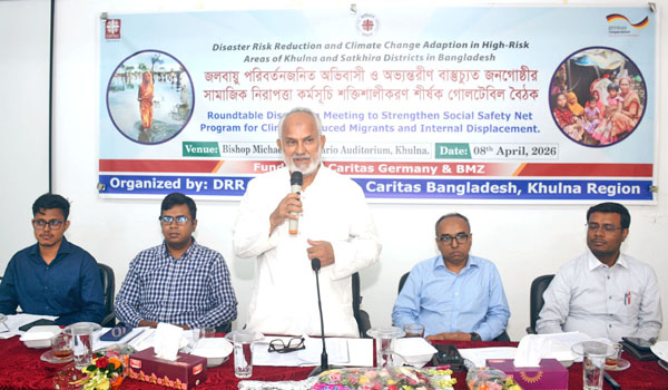 জলবায়ু পরিবর্তনজনিত অভিবাসী ও অভ্যন্তরীণ বাস্তুচ্যুত জনগোষ্ঠীর সামাজিক নিরাপত্তা বাড়ানোর লক্ষ্যে আয়োজিত গোলটেবিল বৈঠক আজ বুধবার (০৮ এপ্রিল) খুলনা কারিতাস আঞ্চলিক কার্যালয়ের সম্মেলনকক্ষে অনুষ্ঠিত হয়। বেসরকারি উন্নয়ন সংস্থা কারিতাস আয়োজন করা এ আলোচনায় প্রধান অতিথি ছিলেন খুলনা সিটি কর্পোরেশনের প্রশাসক নজরুল ইসলাম মঞ্জু।